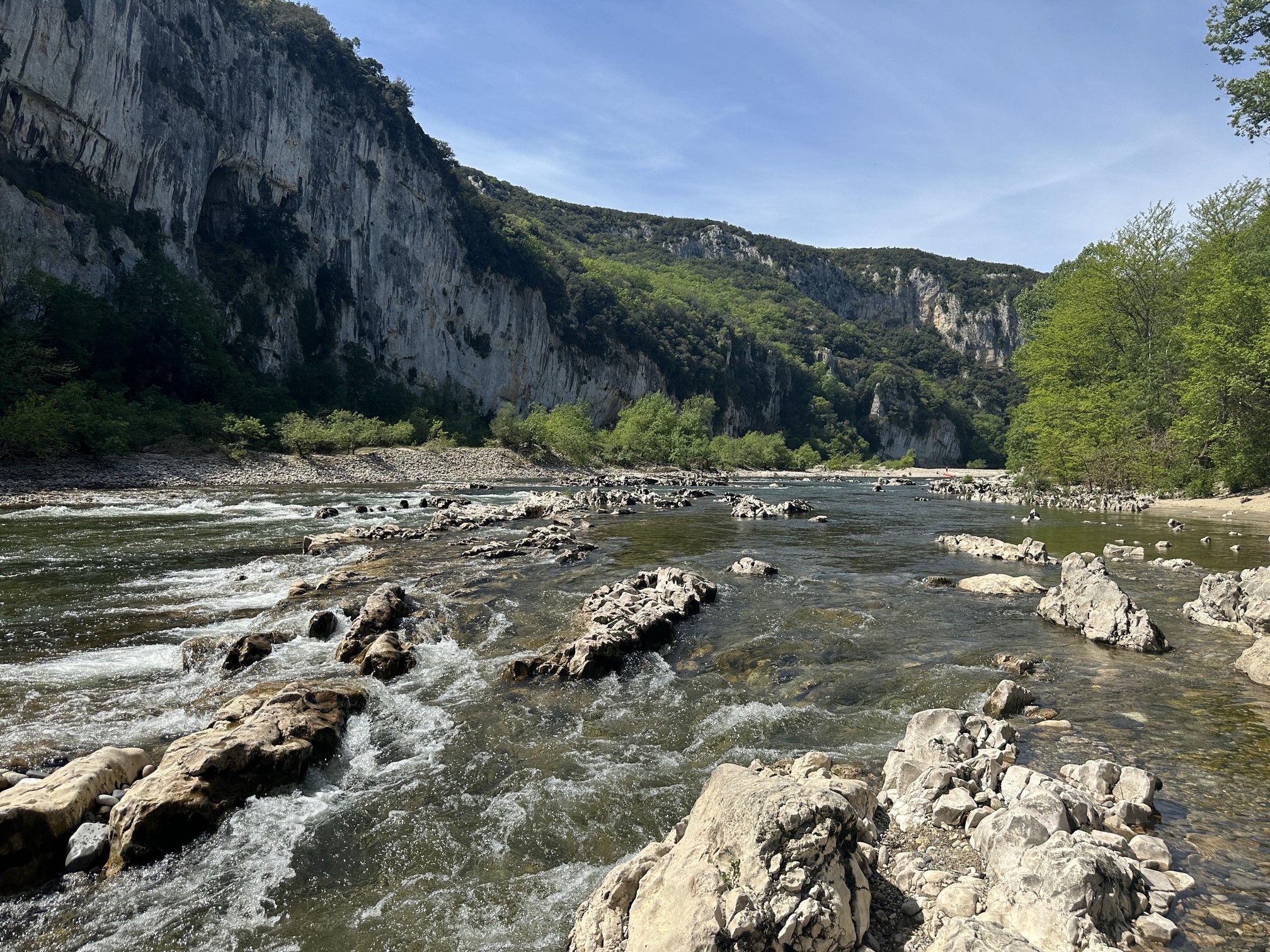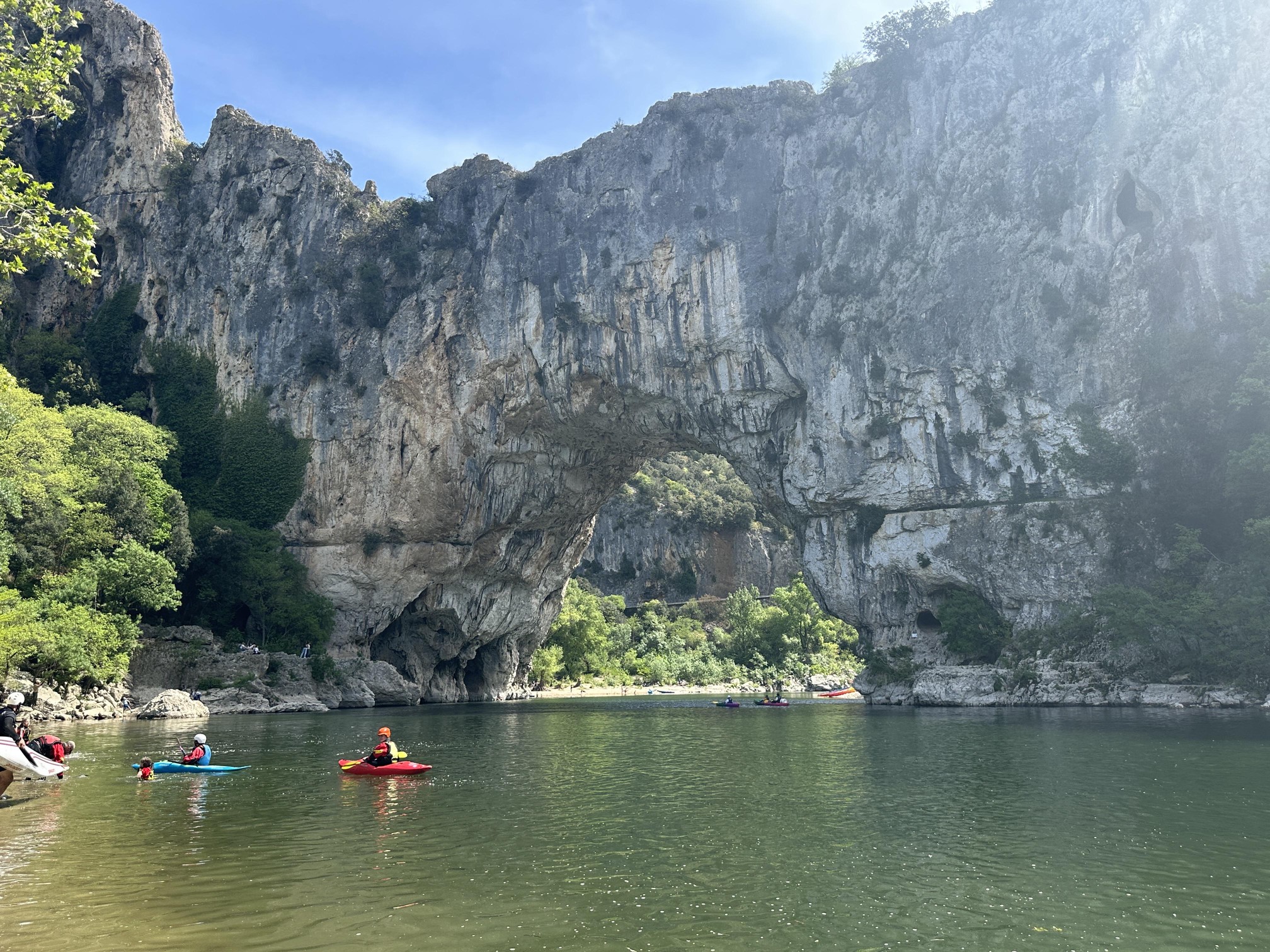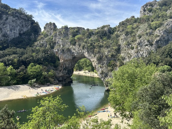 Danach wurden wir dann aber doch belohnt. Das Naturwunder des Pont d’Arc ist wirklich der Mühe wert, und zumindest zu dieser Jahreszeit auch noch nicht überlaufen. Am Strand der Ardèche kann man dort einfach herrlich faul herum hängen und das Treiben der vielen Kajaks beobachten.