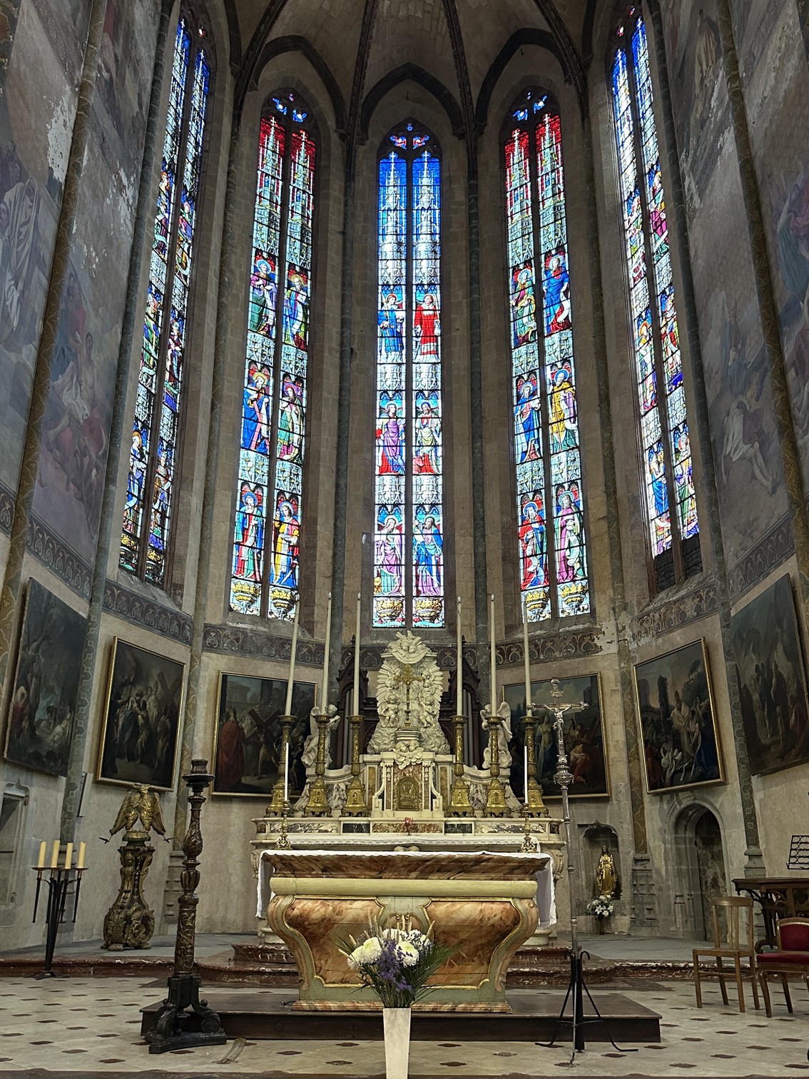 Einen besonders schönen Blick auf das mittelalterliche Stadtensemble hat man übrigens vom Turm der Kirche Saint-Vincent in der Unterstadt, den man mittels 230 Stufen (ja, wir haben gezählt) für 2,50 € besteigen kann. Und auch wenn wir skeptisch waren, aber in der Cité kann man tatsächlich auch gut essen wenn man ein wenig sucht. Wir waren im Le Cachotier und haben zu vernünftigen Preisen hervorragend gespeist.