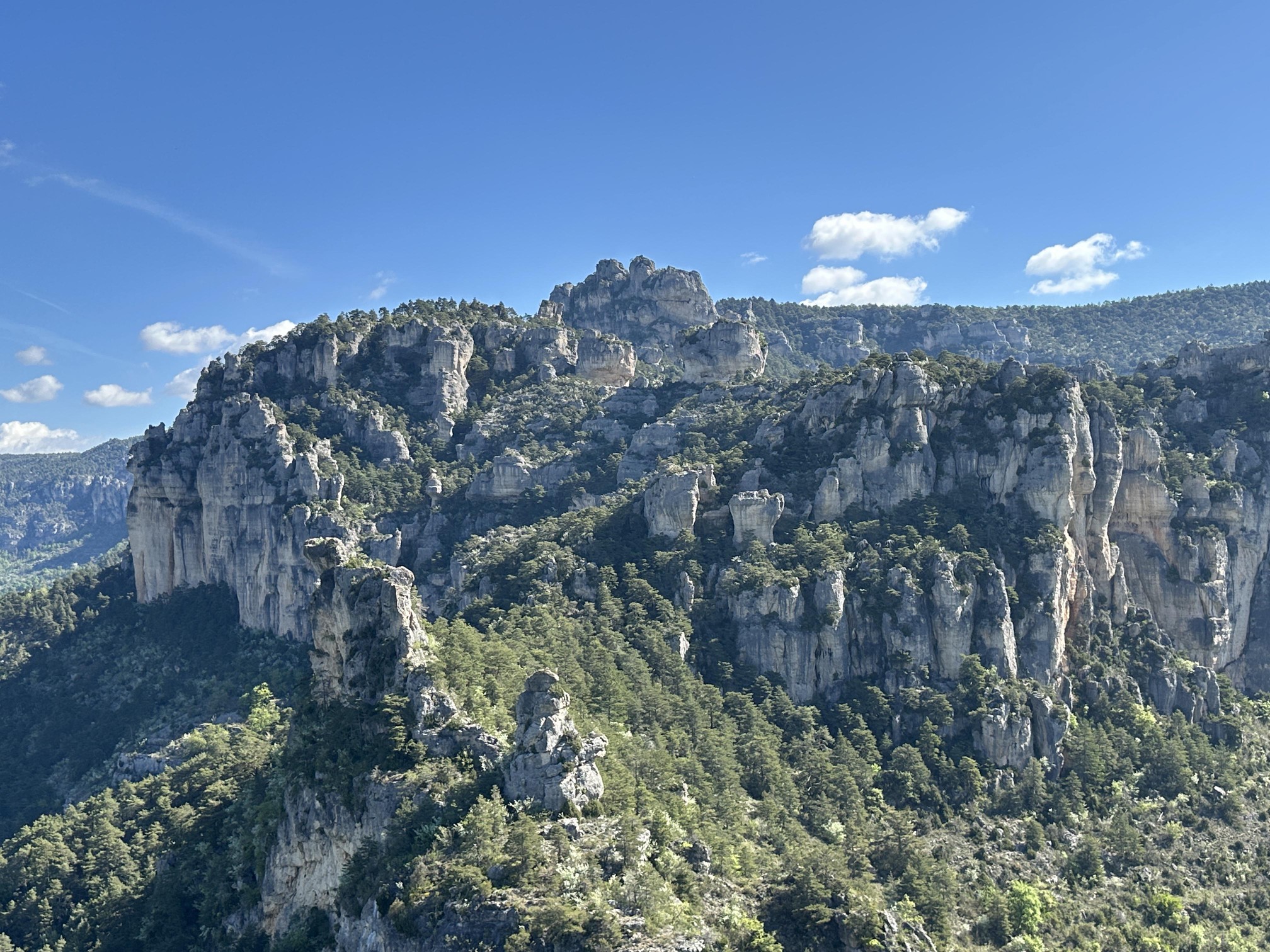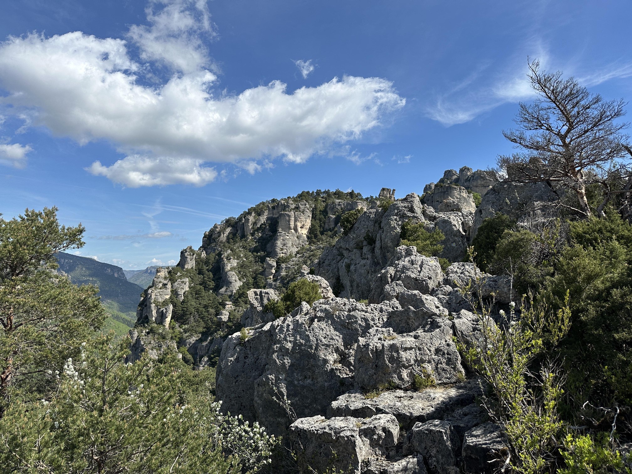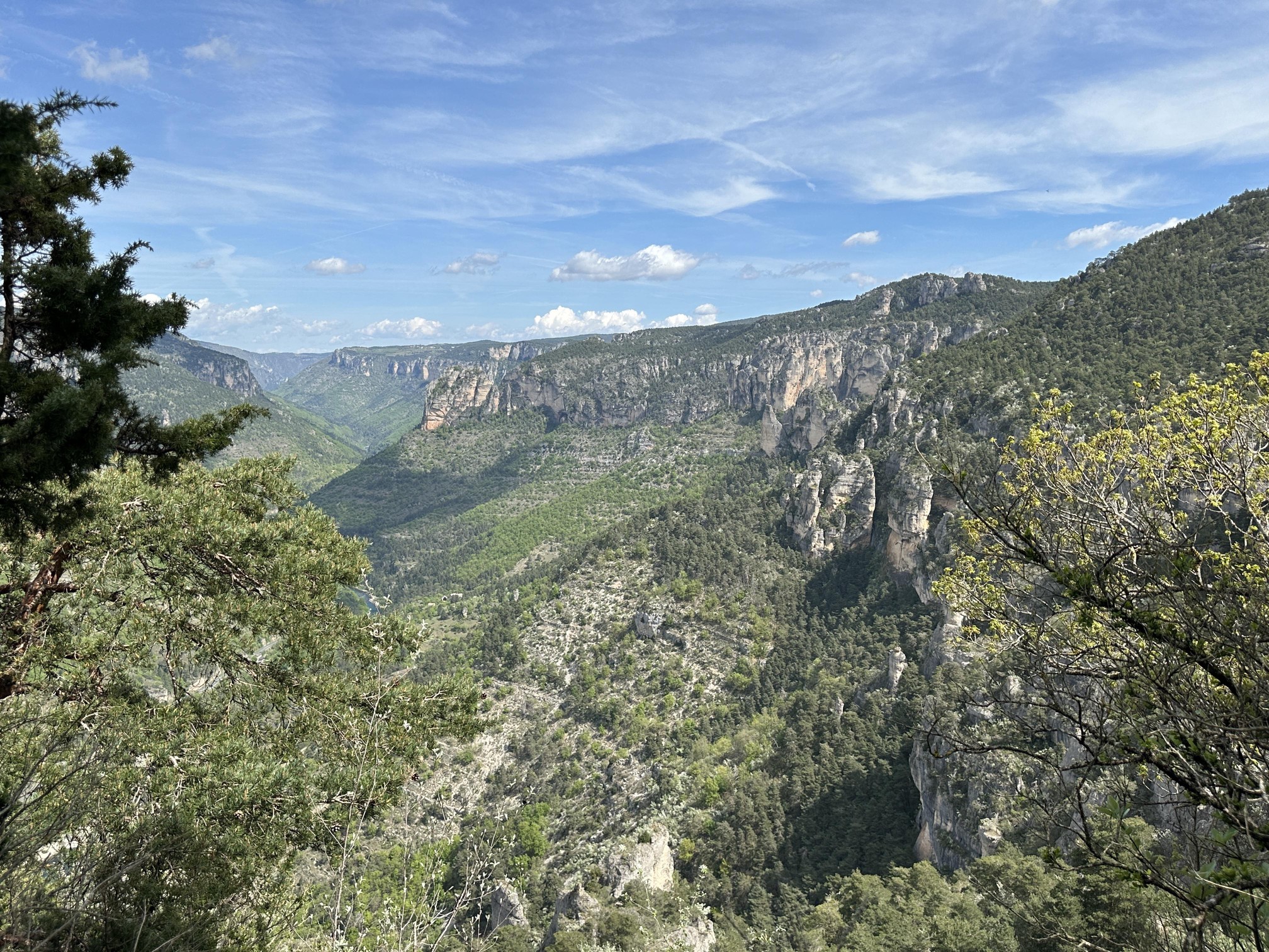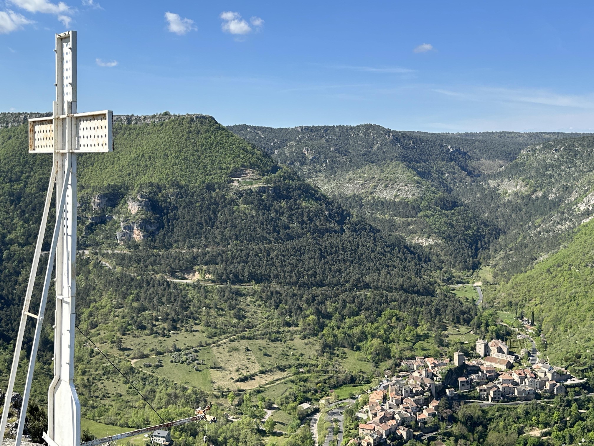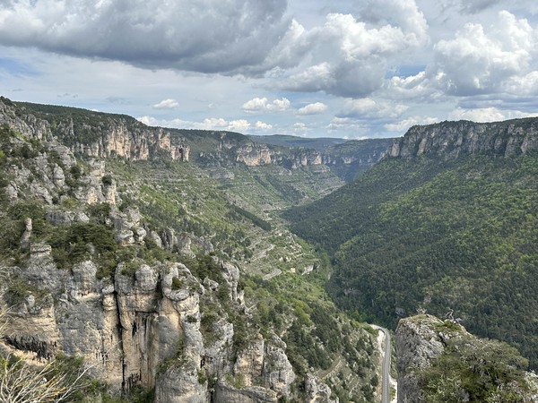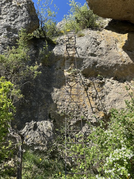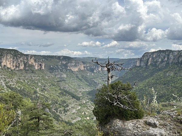 Heute hatten wir uns die erste Wanderung im Tarn-Jonte-Gebiet vorgenommen. Von Le Rozier ging es steil in Serpentinen aufwärts bis zum Fuß des Capluc. Diesen haben wir dann über einige frei stehende Metallleitern und gut in den Fels integrierte Stufen erklommen. Von oben hat man einen spektakulären Ausblick auf die Tarn- und die Jonte-Schucht.