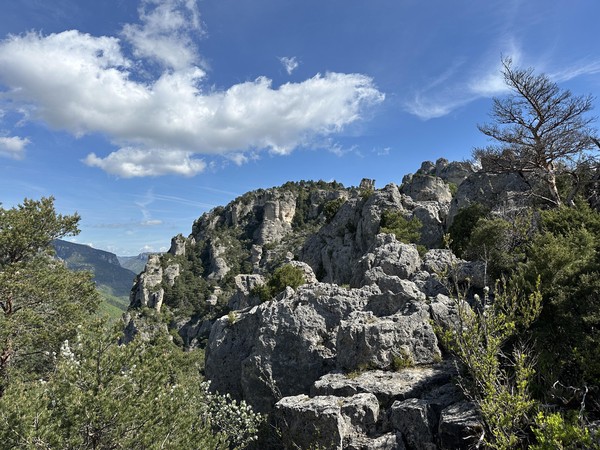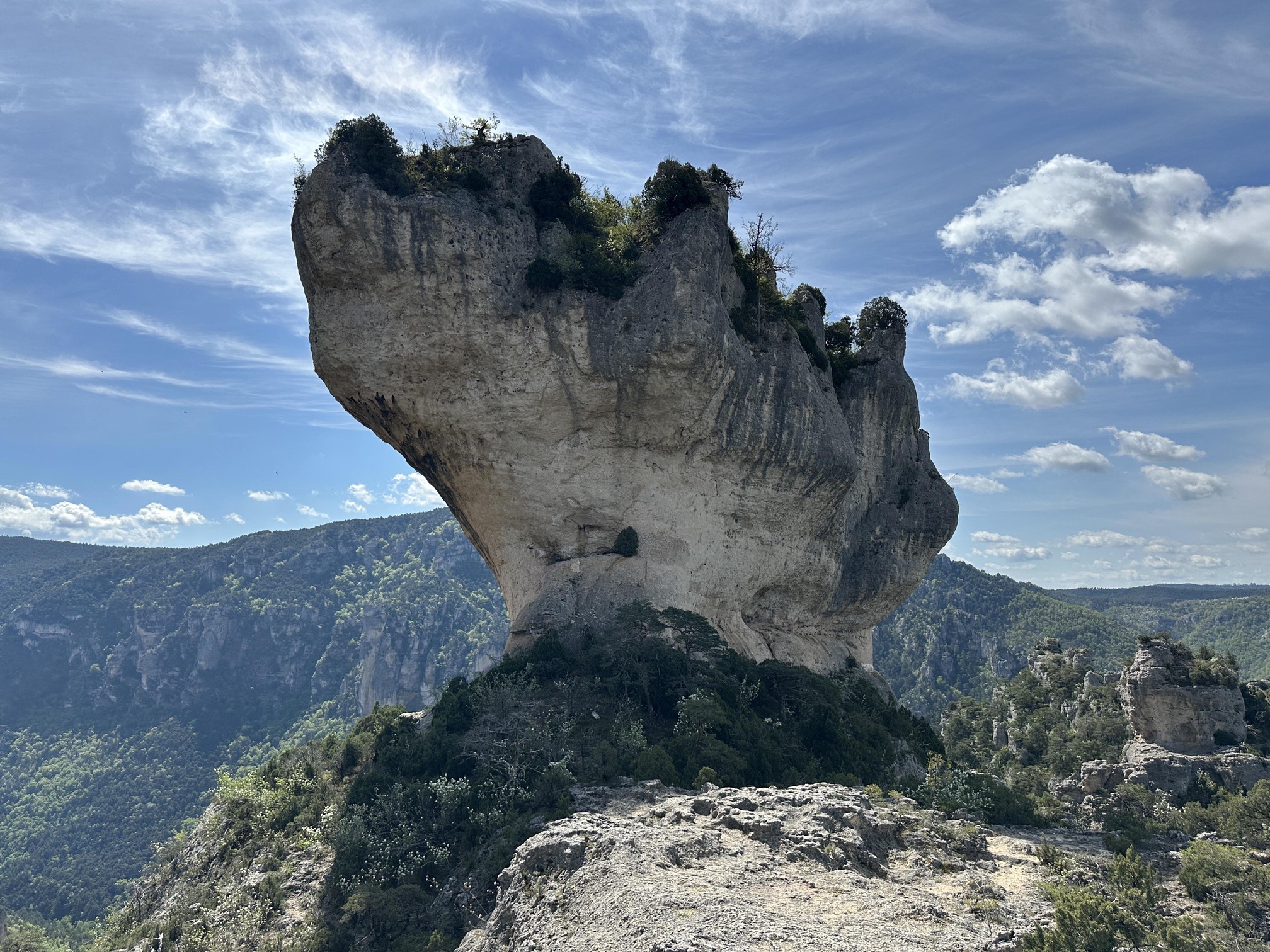 Anschließend ging es anspruchsvoll über den Sentier J. Brunet weiter nach oben, teilweise unmittelbar auf den Felstürmen entlang (T3, Kletterstellen 2, ausgesetzt), bis wir letztendlich wieder auf den “normalen” Wanderweg eingebogen sind. Auf den Rückweg, der direkt an der Kante der Jonte-Schlucht entlang führt, haben wir dann noch Mönchsgeier und Smaragdeidechsen beobachten können. Auch an den seltsamen “Fels-Vasen” sind wir vorbei gekommen. Zum Schluß ging es wieder auf den Aufstiegsweg zurück zum Campingplatz.